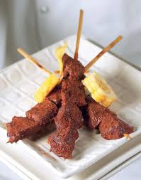 Luego ensartamos la carne en un pincho y la hacemos a la plancha.